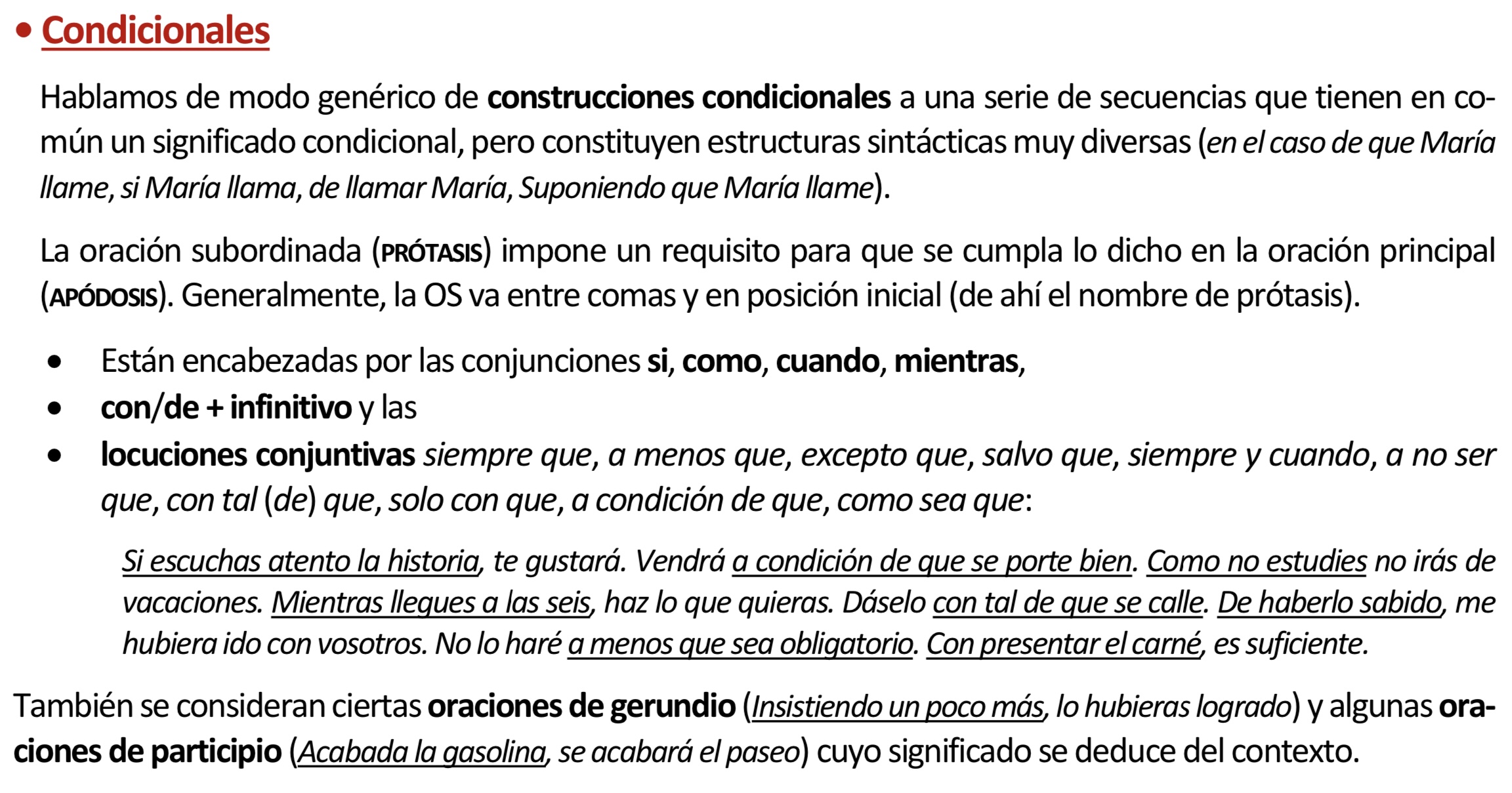 • Condicionales: impone una condición para que se cumpla lo dicho en la proposición principal. Los principales nexos son: si, a condición de que, con tal de que, siempre que...