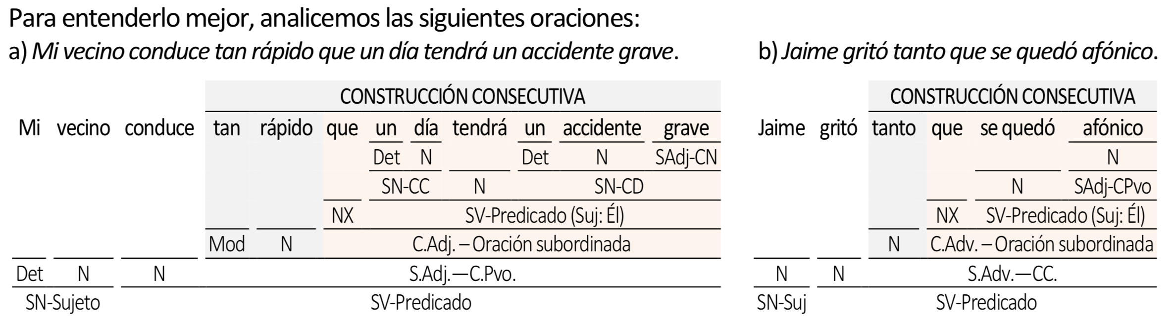 En la Nueva Gramática habla de consecutivas propiamente a construcciones en las que lo elevado de una maSNitud provoca un efecto -ejemplo a)- y consta de dos partes (como en las comparativas); y llama ilativas a aquellas otras en las que la oración subordinada expresa la consecuencia directa de la oración principal -ejemplos del apartado b)-. Aquí trataremos a ambos grupos con el nombre de consecutivas.