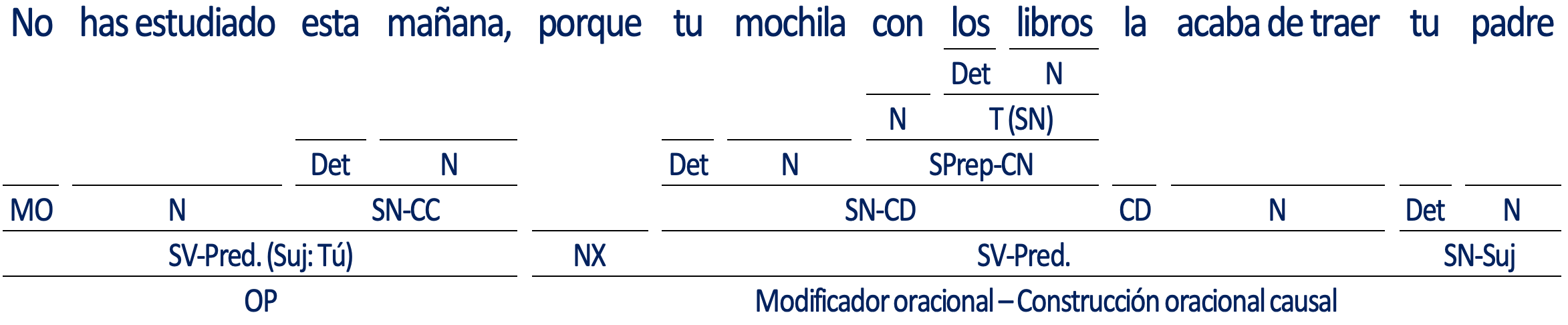 - "No has estudiado esta mañana, porque la mochila con los libros la acaba de traer tu padre"