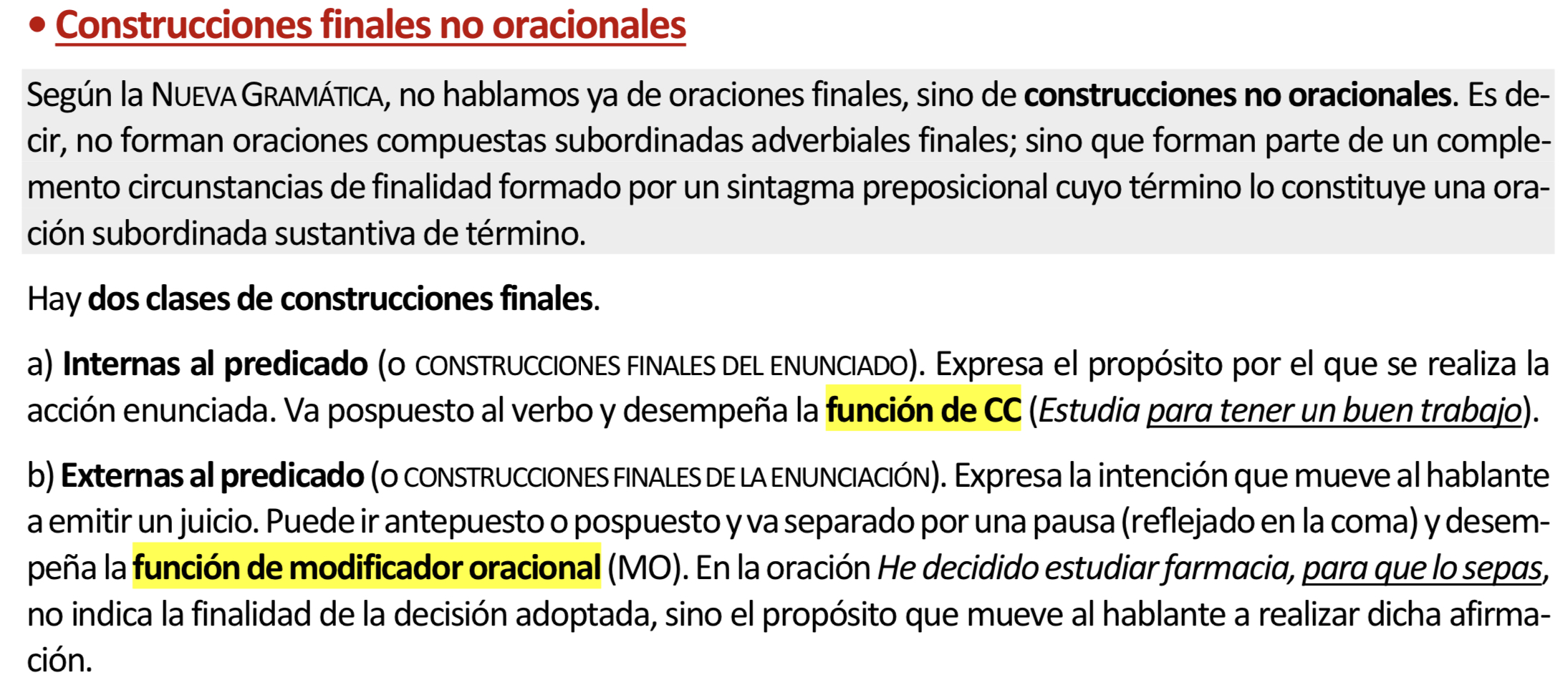 • Finales: informa de la finalidad por la que se lleva a cabo la acción principal. Los nexos son: para (que), a fin de que, con el objeto de que...