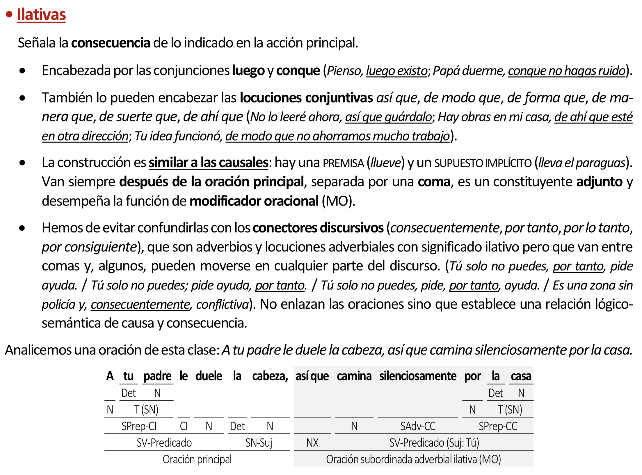 • Consecutiva: muestra el resultado de la proposición principal. Nexos son: por lo tanto, así que, luego, pues, de tal modo que, tanto… que, etc.