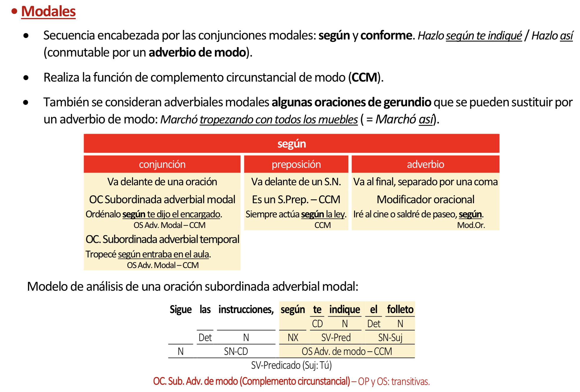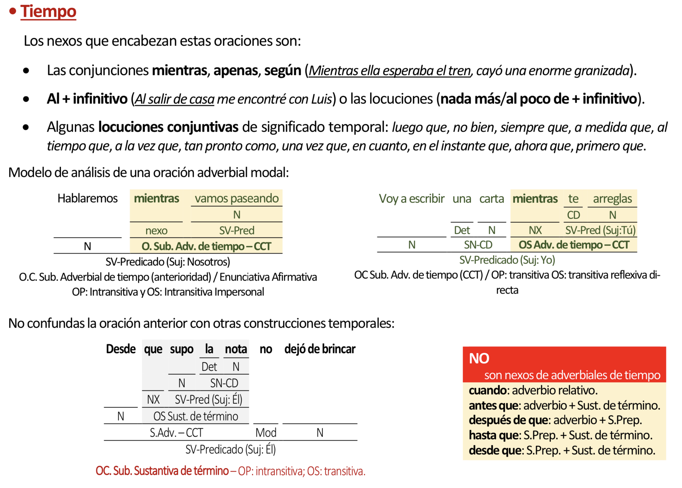 • Tiempo: señala el momento en que se realiza la acción. Nexos son: cuando, mientras, antes de que, en cuanto, después de que, hasta que, mientras que, etc. El nexo nos indica si la acción que se realiza es anterior, a la vez o con posterioridad a la principal.